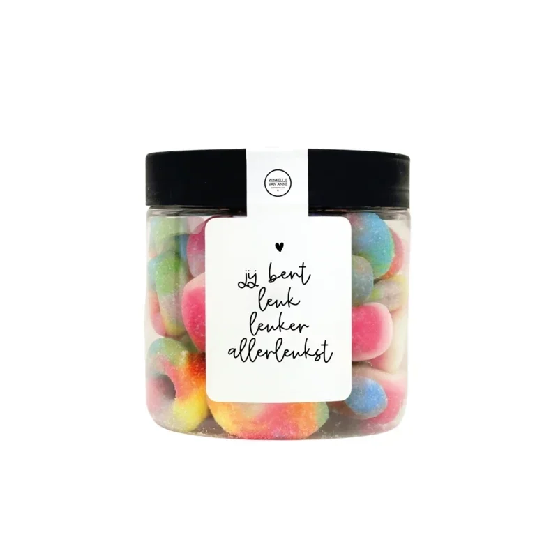 Smulpotje met snoep. "jij bent leuk, leuker, allerleukst"