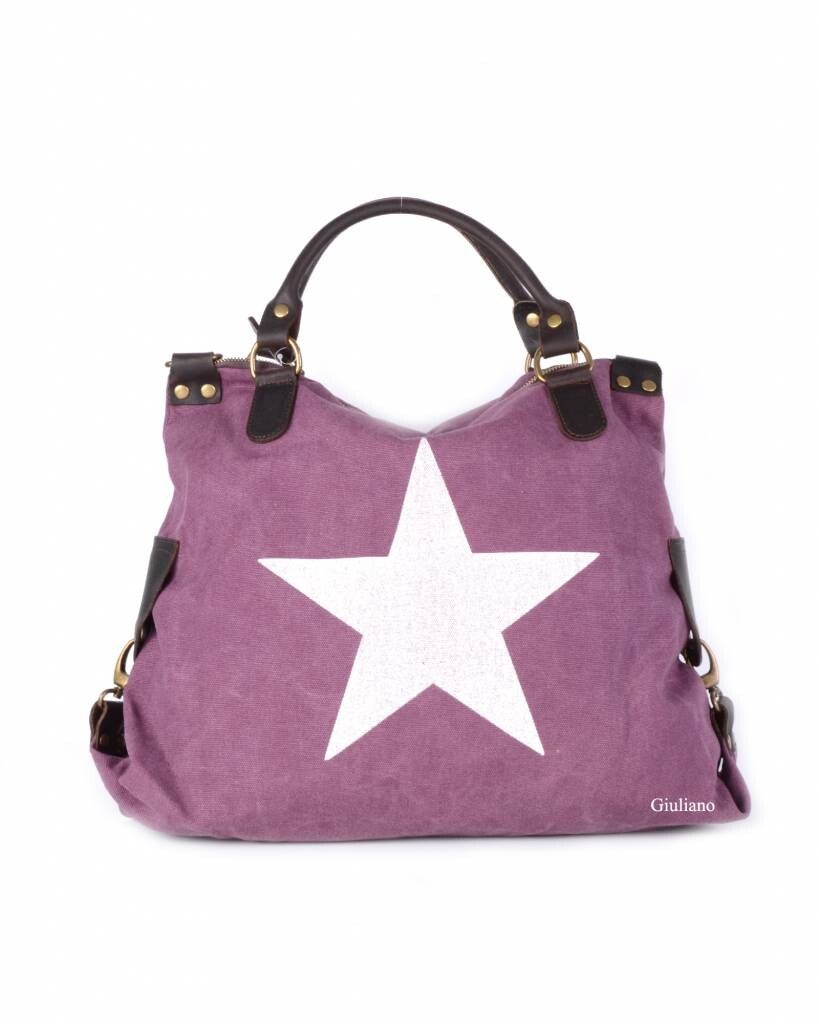 Canvas tas met lederen handvatten en bedrukt met een ster op de voorzijde. De tas sluit met een rits en heeft nog een afneembare en verstelbare schouderband.