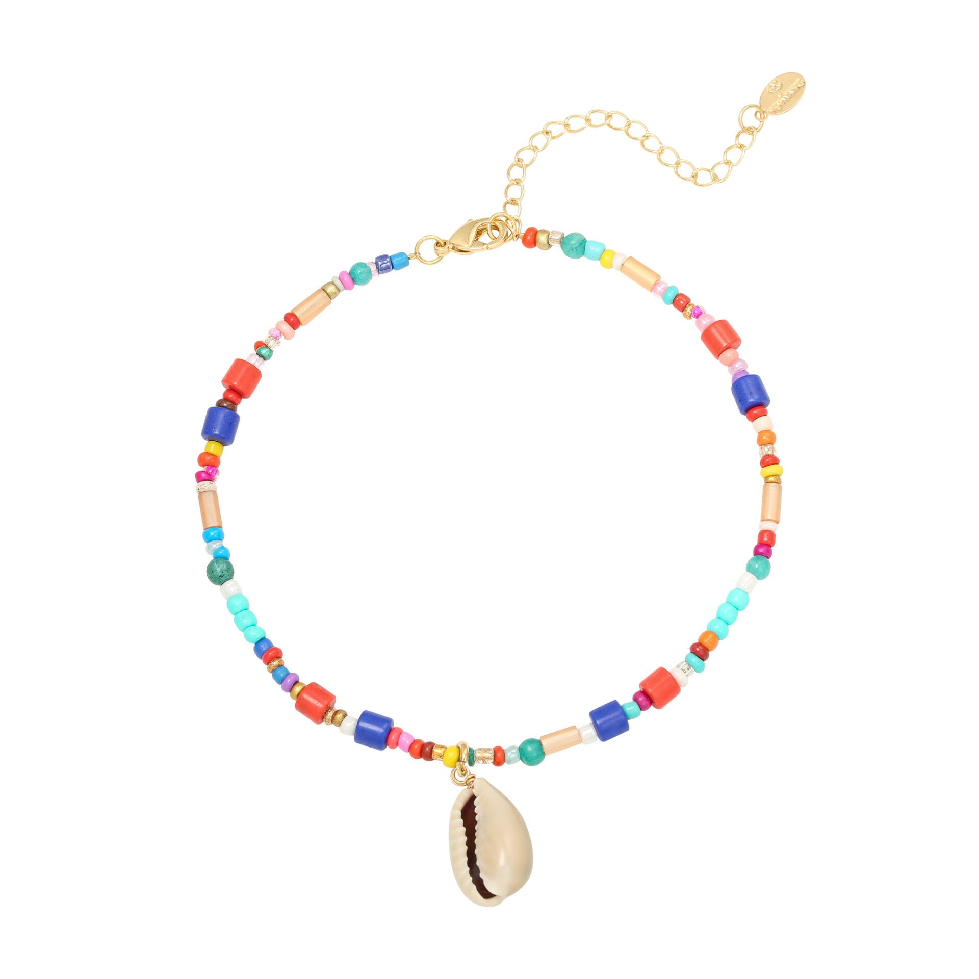 Enkelbandje met kleurrijke kralen en een schelp.