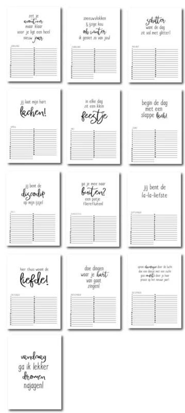 De kalender heeft 14 pagina's bestaande uit een voorkant, 12 maanden met leuke quotes en een te gekke poster! Zo vergeet je nooit meer een verjaardag, en hij staat ook nog eens erg leuk in je interieur!