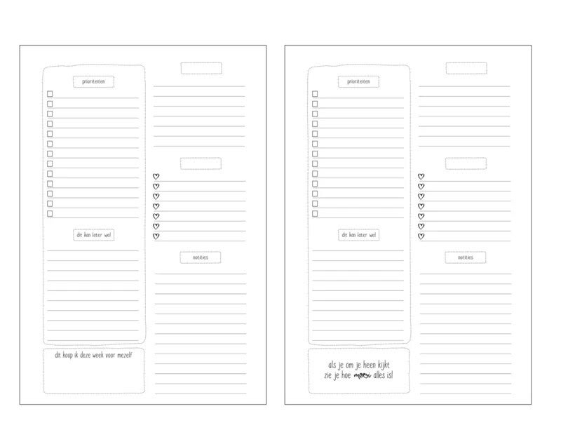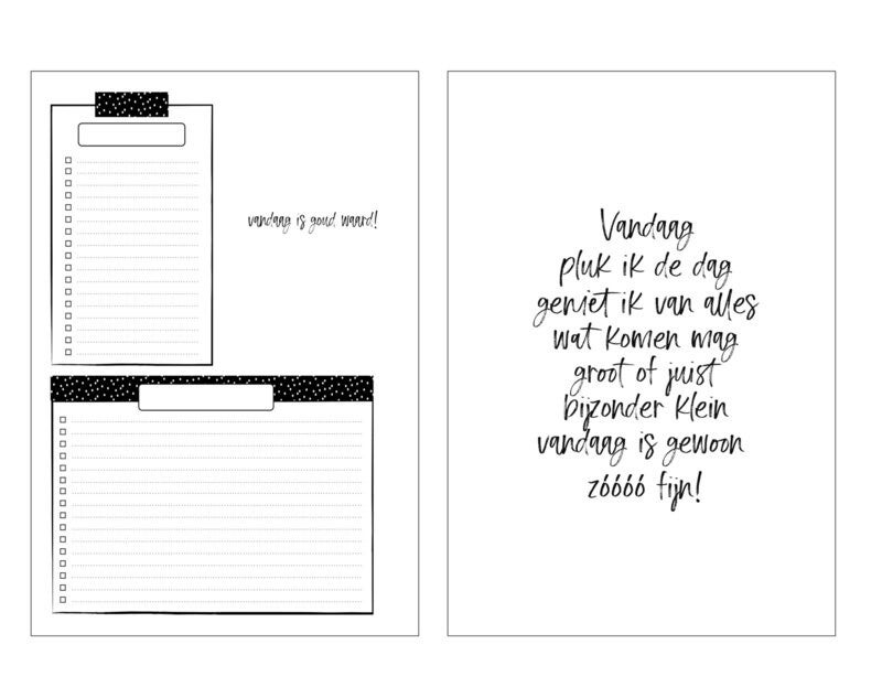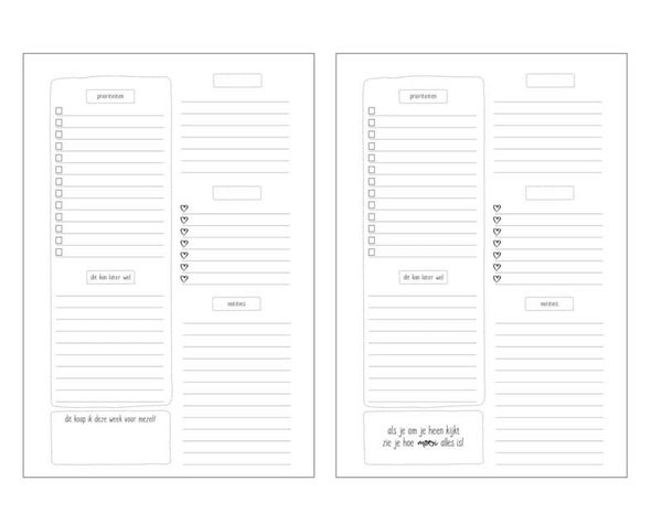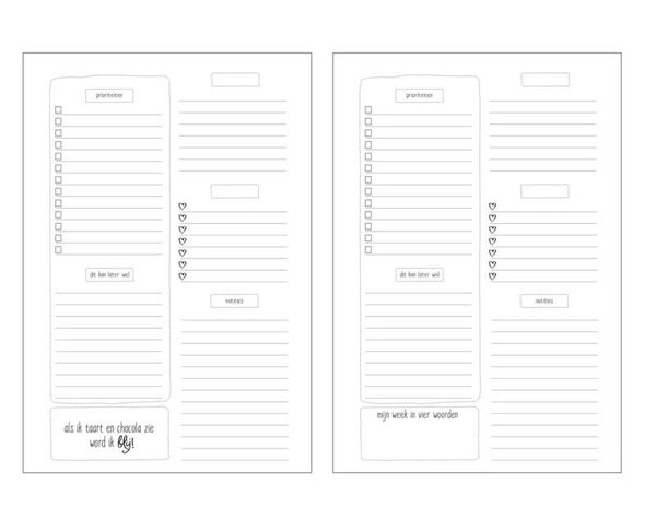 Elke twee pagina's biedt ruime voor prioriteiten, taken die kunnen wachten en notities. Ook is er vrije ruimte voor eigen invulling, bijvoorbeeld voor social media of sport. Aan het begin van deze planner vind je een bucketlist om in te vullen, achterin is er ruimte voor heel veel notities en adressen.
