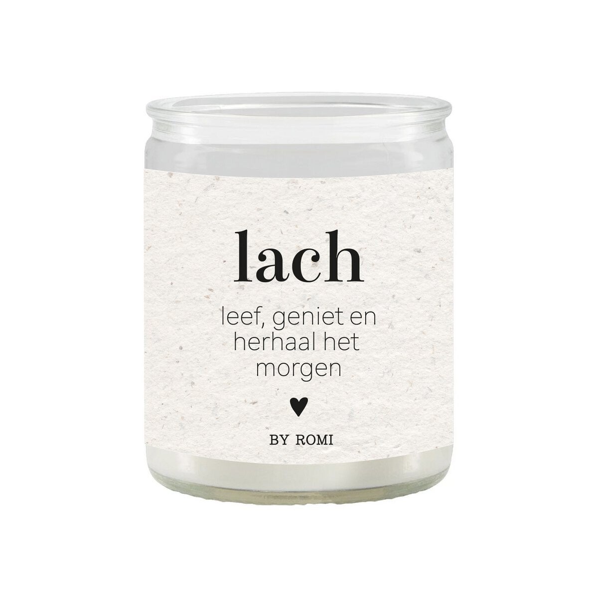 Een mooie kaars van By Romi in een glazen pot. Aan de kaars hangt een label, op de achterzijde van het label is ruimte voor een persoonlijk tekstje.